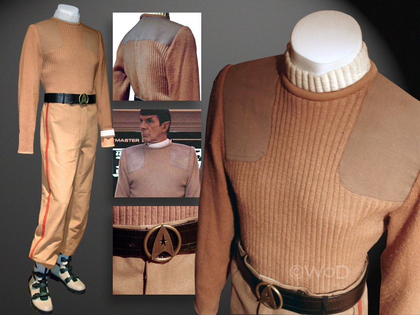 Worn throughout much of the movie, these commando uniforms were a new addition to Star Trek. This is a Spock version and is identified with "L Nimoy" tags. Made from a British commando sweater with wool pants and heavy boots.