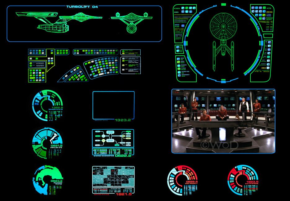 This is a series of plexiglass panels with various controls and readouts applied to give the impression of 23rd century control surfaces. These were backlit and combined with live monitors showing animations to complete the effect. Designed by Star Trek designer Mike Okuda, this look was used from Star Trek IV through VI.