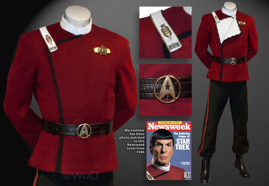 Leonard Nimoy's actual uniform from TVH. Beginning with Wrath of Khan, the officers began to wear these dashing uniforms. This jacket has been specifically photo-matched to a series of Voyage Home PR shots. It also appears to match the version Nimoy wears on-screen.