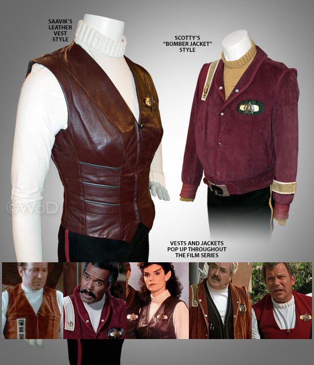Star Trek III would also introduce a new jacket – the so-called "bomber" style, named after the jacker worn by WWII Bomber pilots. Starfleet Commander Morrow and Scotty both sport their own versions of the bomber while Kirk would get one in Star Trek V. By the time Star Trek: Generations came along, Kirk would get another vest variant.